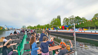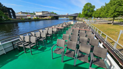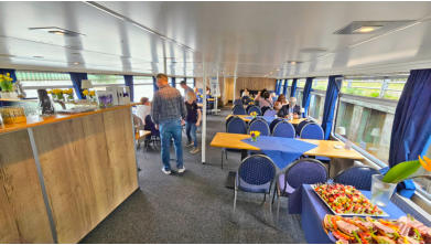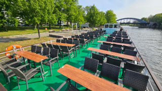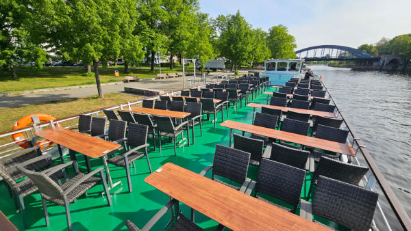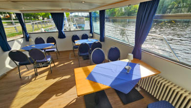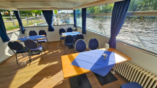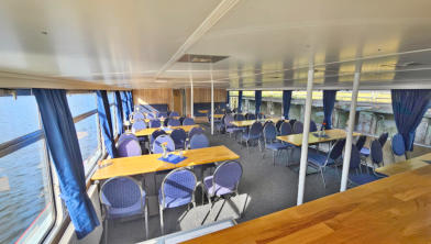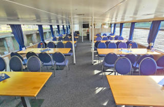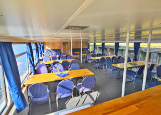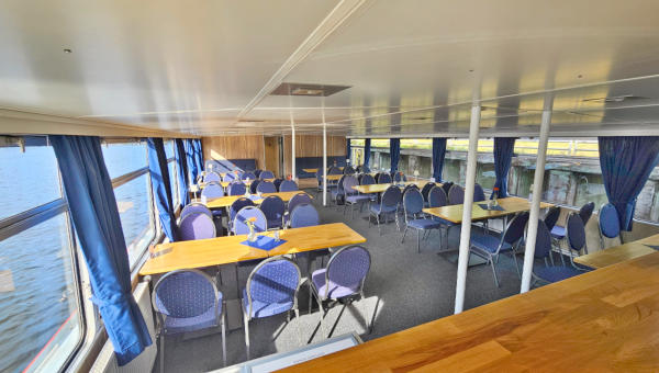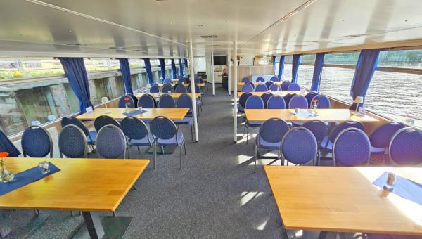Hauptsalon: 66 Sitzplätze, Vorderer Salon: 16 Sitzplätze, Oberdeck: 100-120 Sitzplätze an Tischen mit flexibler Bestuhlung