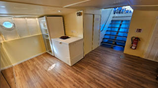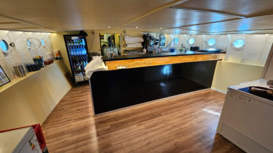 Tresen / Bordbar im Unterdeck - mobiler Oberdecktresen - WC Damen/Herren - Musikanlage & Funkmikrofon - Buffetbereich im Salon - TV Flachbildschirm